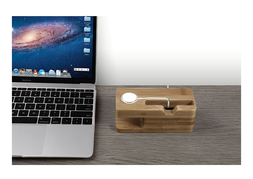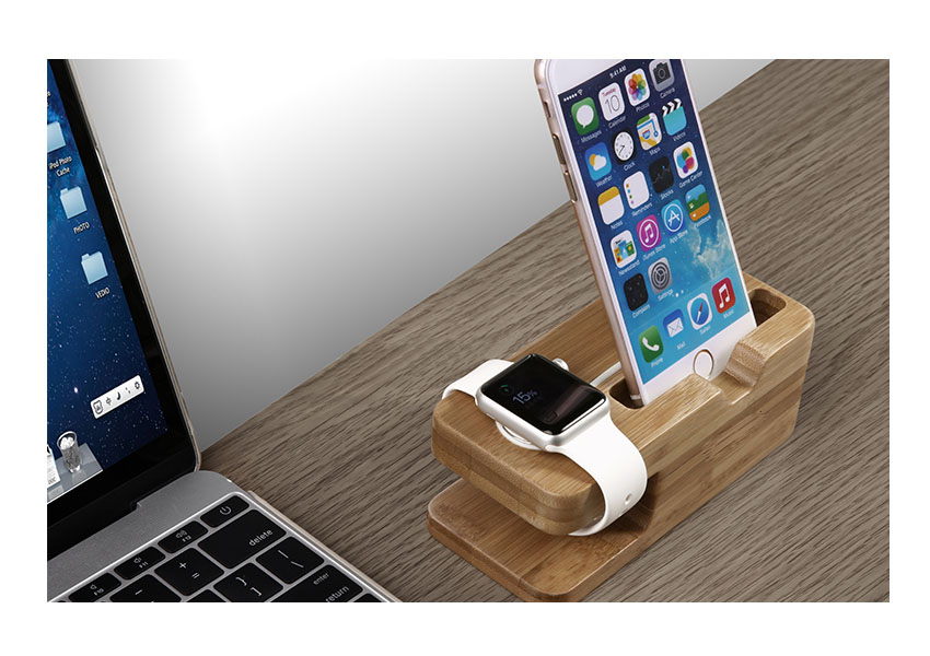 Genuine natural wood docking station for iPhone 6 and Apple Watch 38mm 42mm. Special cutout for the Apple Watch charger and cable, non-slip base and no-scratch padding hold your Apple devices in place on desk or table top. A great place to keep your Apple Watch clean and safe while charging.